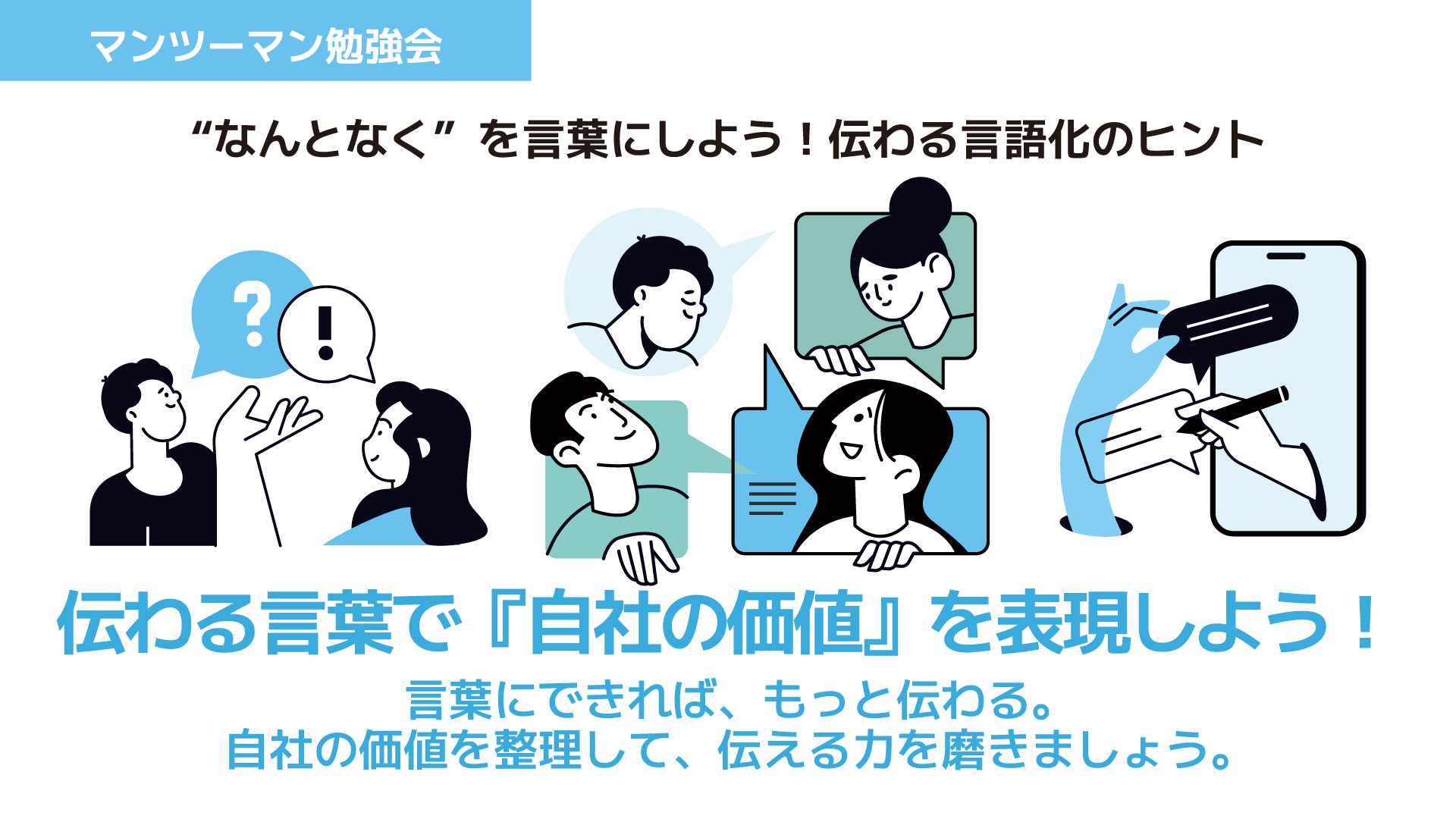 申し込み受付中伝わる言葉で『自社の価値』を表現しよう!-「自社の魅力をうまく説明できない」「何を強みにして良いか分からない」——この勉強会では、自社が“選ばれる理由”を整理し、相手に伝わる言葉で表現する方法を学びます。 マーケティングの基本視点(誰に・何を・どう伝えるか)を使いながら、商品やサービスの価値を言語化。 名刺、HP、SNSなどあらゆる媒体で使える“伝わる言葉”を一緒に考えましょう。